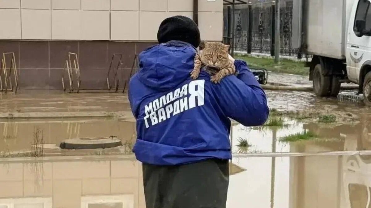 Из подтопленных домов спасают не только людей, но и питомцев. Фото: телеграм-канал «Молодая Гвардия»