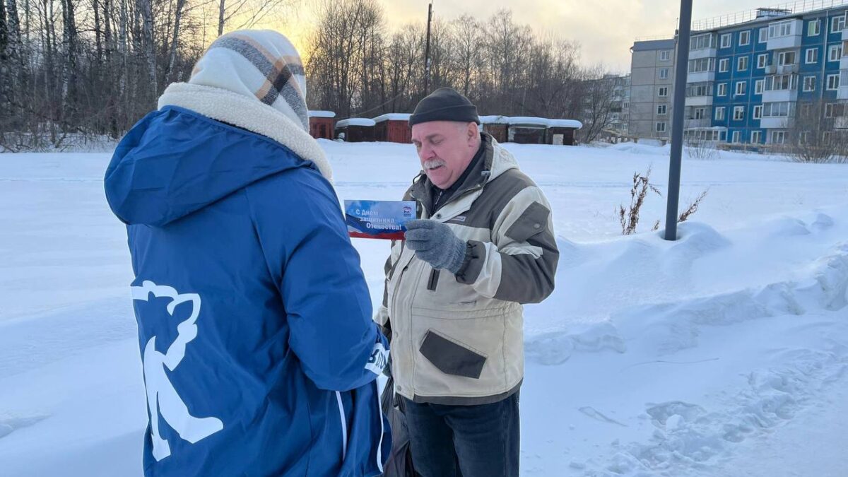 Волонтёры муниципального штаба флагманской программы «Мы вместе» поздравили мужскую часть населения округа, вручая открытки от Молодёжного центра «Навигатор» и Всероссийской политической партии «Единая Россия».