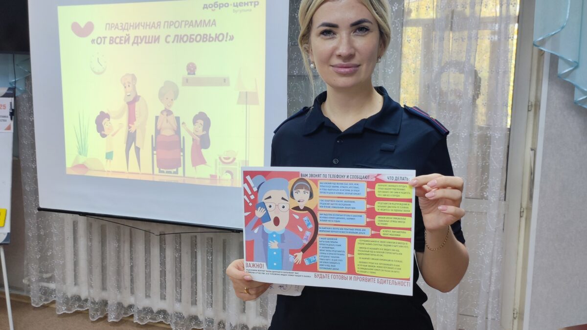 Но пожилые люди не только пели и развлекались. Перед ними с познавательной и профилактической информацией выступила старший инспектор направления по связям со СМИ отдела МВД России по Бугульминскому району Диана Галяува. Она рассказала пенсионерам, как не стать жертвой мошенников, проинформировала присутствующих о правилах поведения с незнакомыми людьми, приемах, которыми обычно пользуются мошенники, и способы противодействия им.