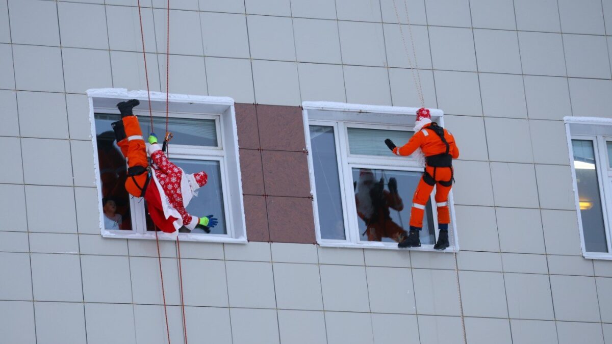 С помощью специального оборудования специалисты спустились к окнам больничного корпуса, чтобы поздравить детей с наступающим праздником. Акция «Десант Дедов Морозов», как часть всероссийской акции «Новый год в каждый дом», проходит сейчас по всей стране. Дедами Морозами выступают спасатели, студенты, сотрудники различных ведомств.