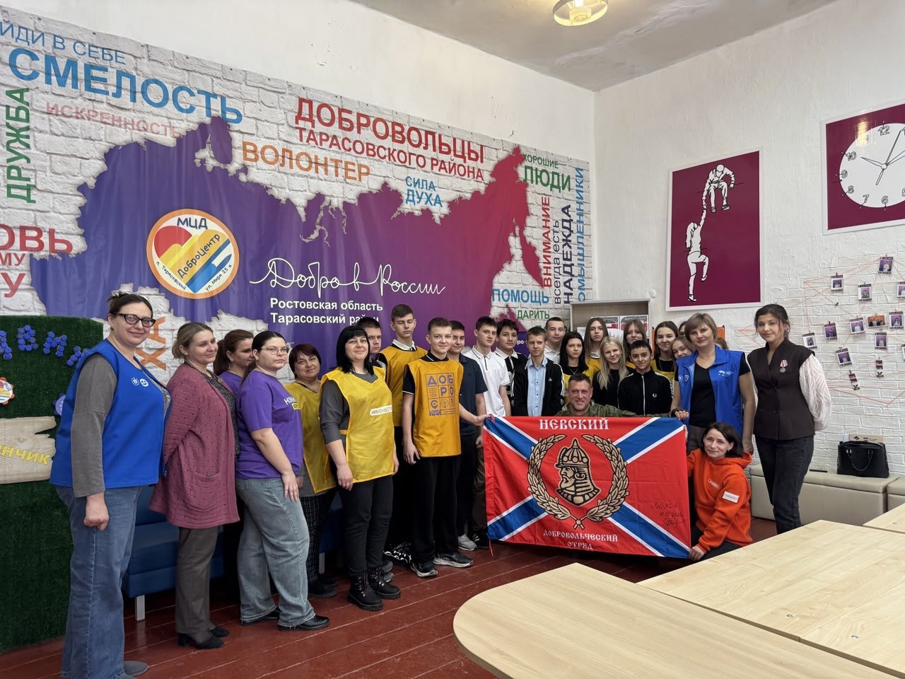 Юный волонтер Тарасовского района Мария Курносова, награжденная медалью «Волонтер России» организовала встречу с участником СВО с позывным «Волга» для школьников и волонтеров Добро.Центра Тарасовского района.