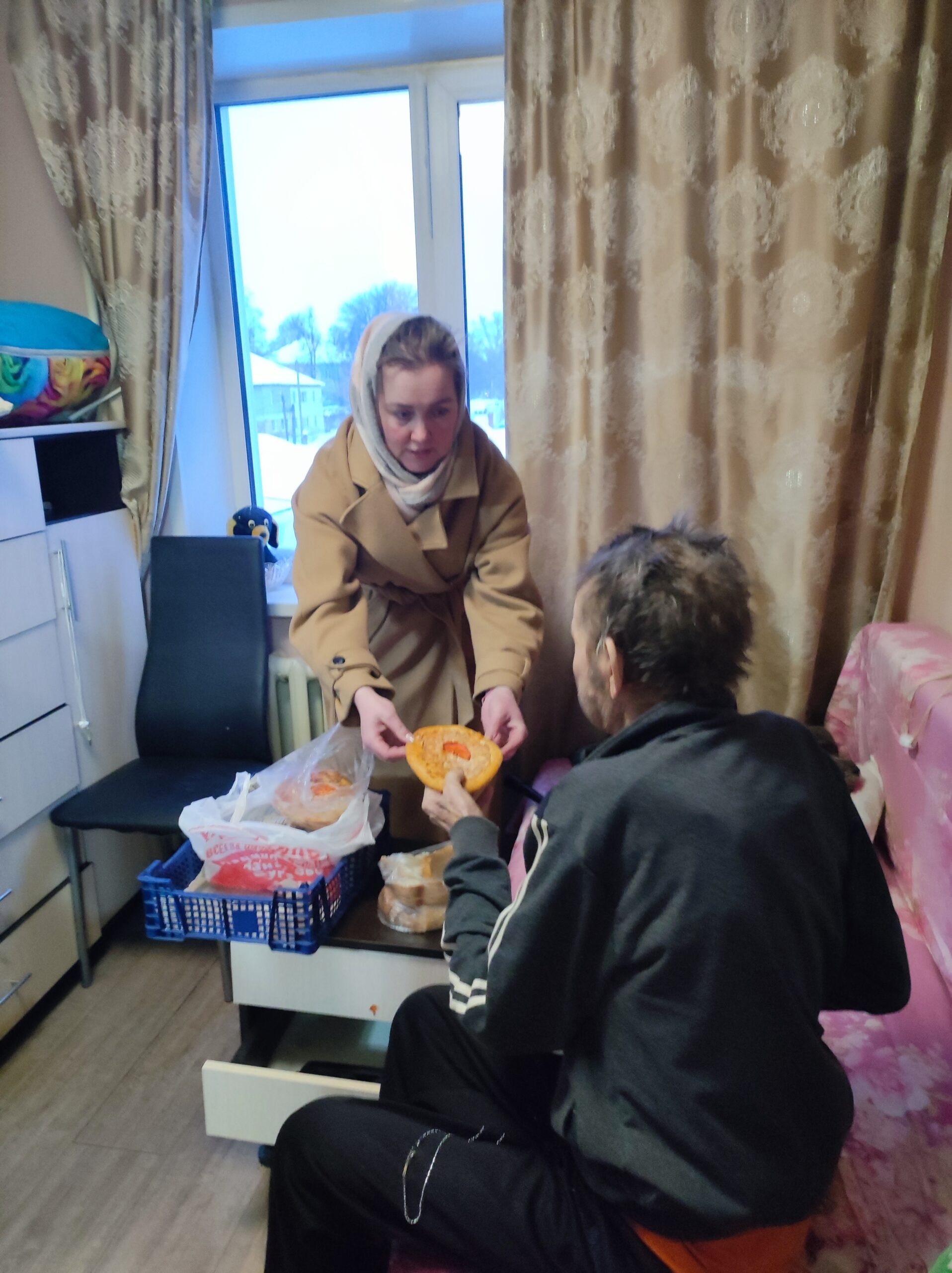 Прежде всего, добровольцы пообщались с пожилым человеком и узнали его потребности. Накормили вкусной горячей едой и выпечкой, предоставленными одним из местных ресторанов. Провели санитарную обработку квартиры, переодели в чистую одежду, постирали белье.
