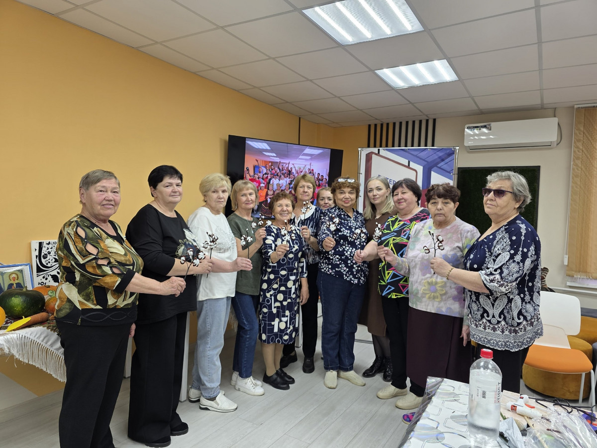 Мероприятие началось с выставки художественных работ, где были представлены картины ветеранов, вышивка крестиком и алмазная мозаика. Это позволило гостям увидеть разнообразие техник и стилей, а также оценить мастерство участников.После выставки состоялся мастер-класс «Хлопковая веточка». Под руководством мастера Виктории Парыкиной участники создавали композиции из синельной проволоки, развивая творческие способности и навыки командной работы.