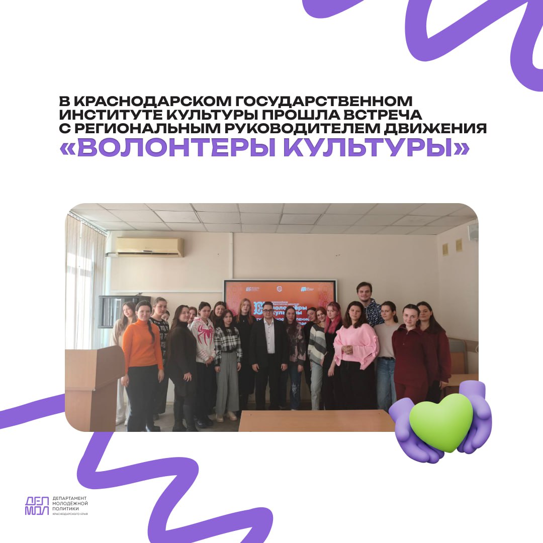 В Краснодарском государственном институте культуры прошла встреча с главным специалистом Центра молодежных инициатив и региональным руководителем движения «Волонтеры культуры» Никитой Черемных.