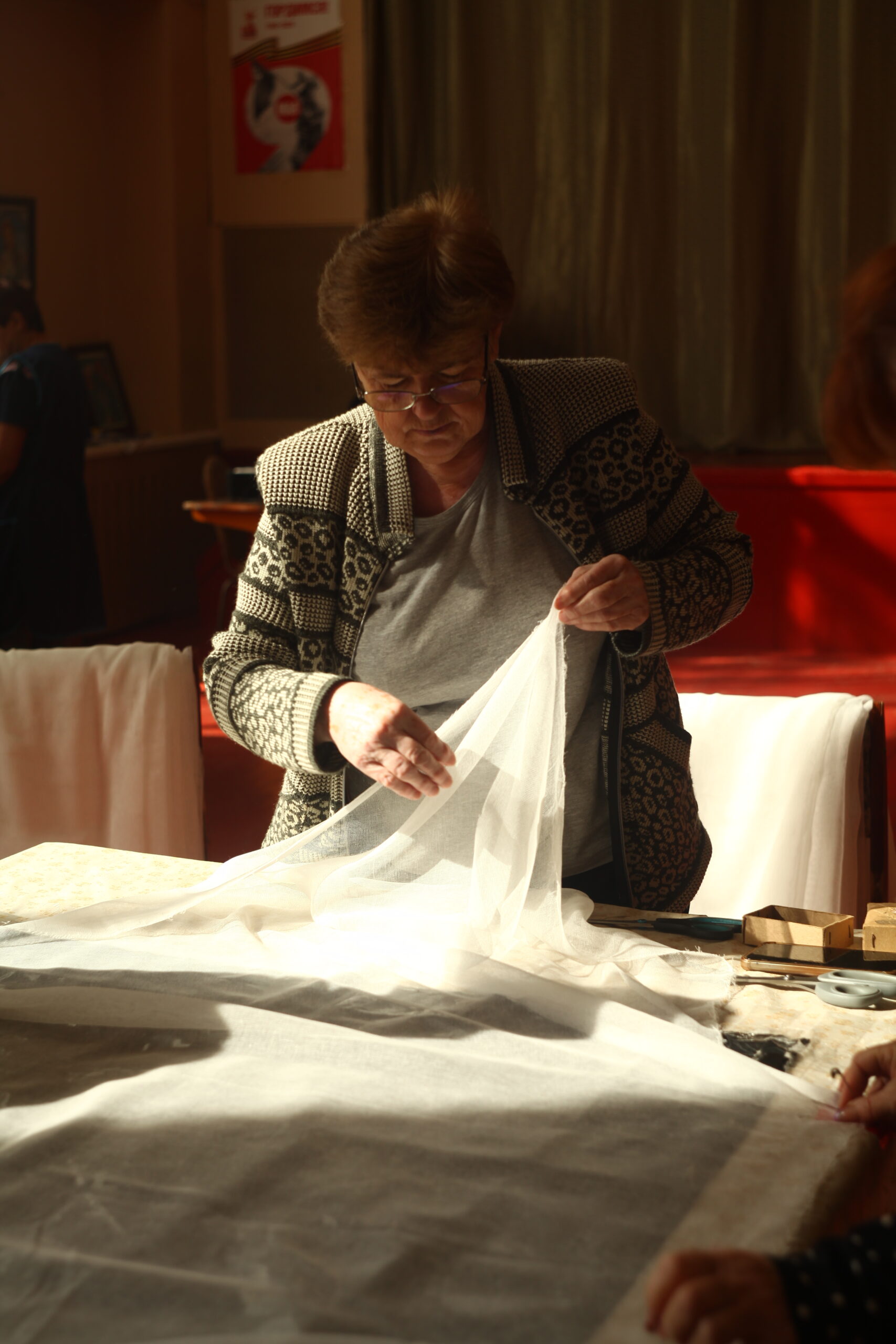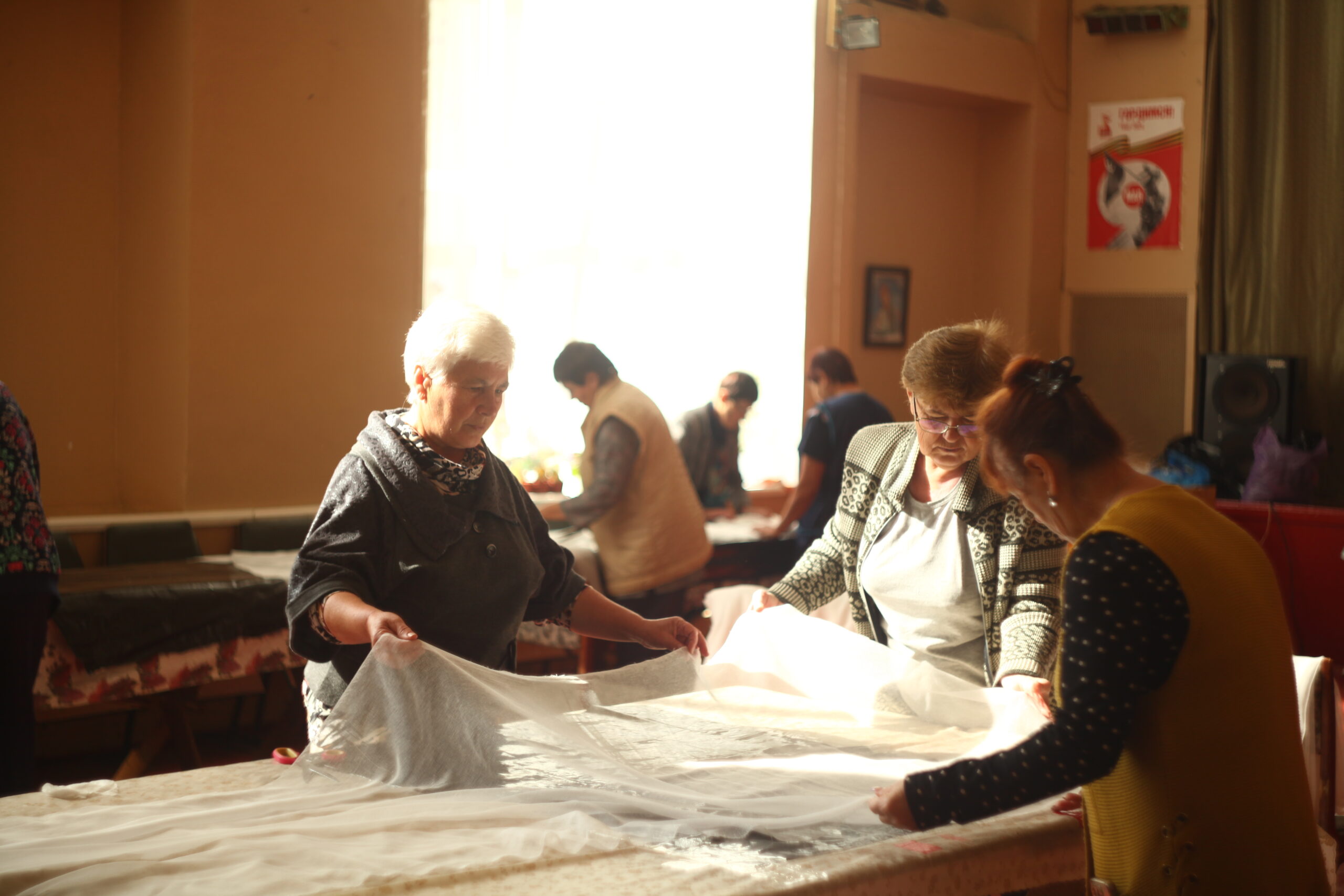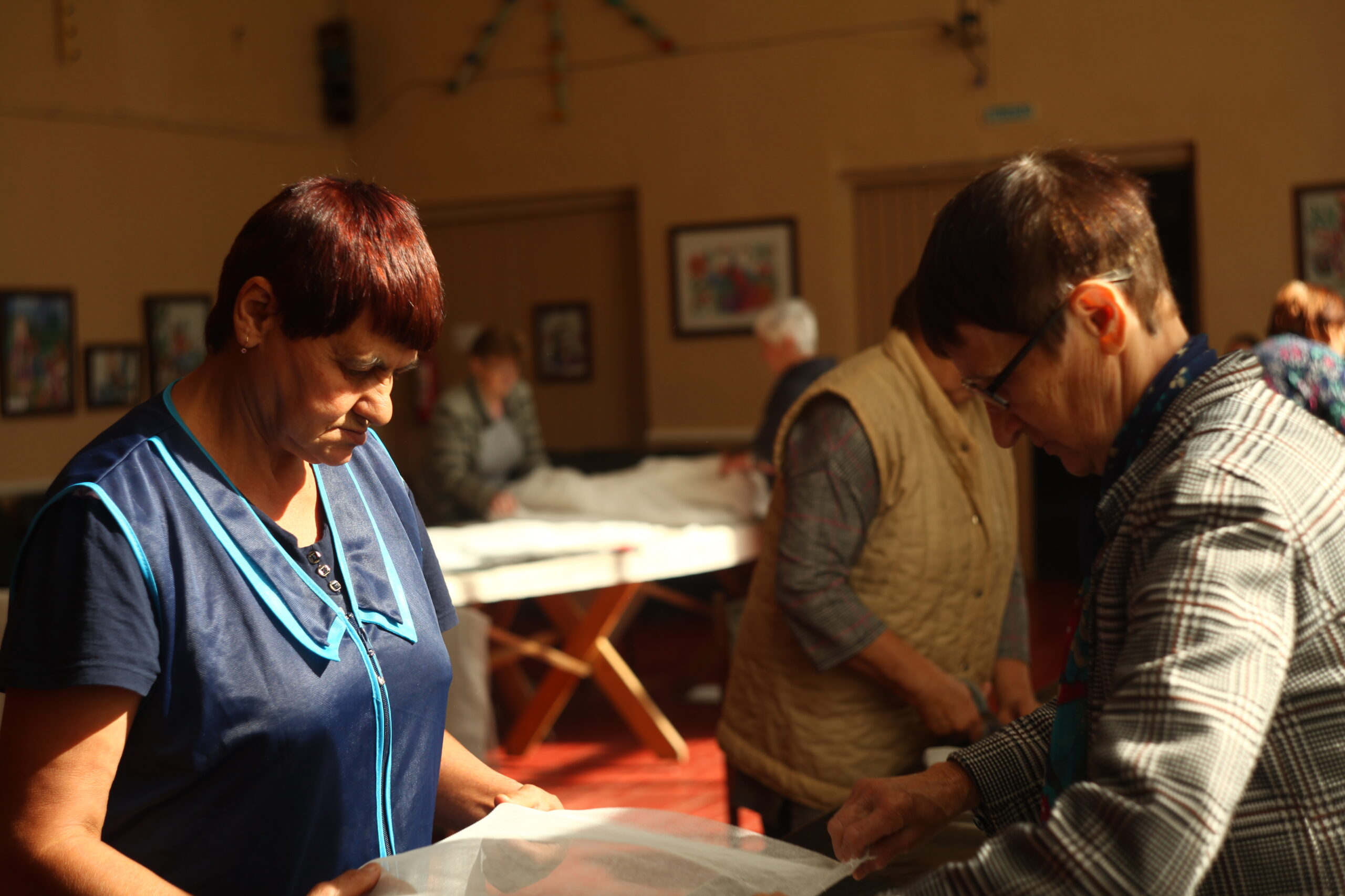 На регулярной основе здесь трудятся 12 серебряных волонтеров. Работа не прерывается даже в летний период, когда у селян особо напряженный сезон. Каждый день, с понедельника по пятницу, мастерицы режут марлю. За три часа работы в день они подготавливают около 1000 салфеток. За неделю в перевязочный материал превращается один километр марли!