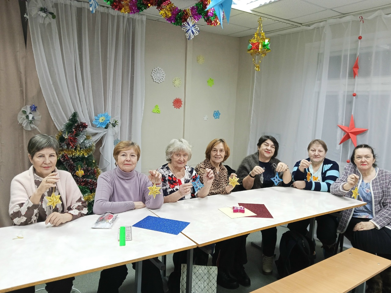 В уютном праздничном зале «ДомАктив» состоялся творческий мастер-класс для людей пожилого возраста. Специалист организационно-консультативного отделения Олеся Горбатова вместе с «серебряным» добровольцем Любовью Артеевой научили дам «элегантного» возраста изготовлению ярких снежинок.