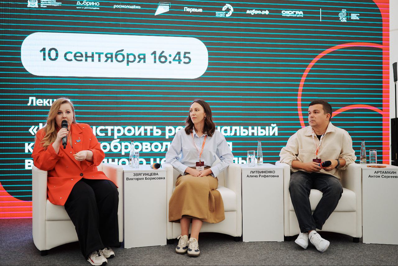 Так, Виктория Звягинцева выступила в качестве эксперта в дискуссии, посвященной теме добровольчества как движущей силы развития регионов. На площадке обсуждались вопросы мотивации волонтёров, работа с разными возрастными категориями и выстраивания взаимодействия с властью и бизнесом.