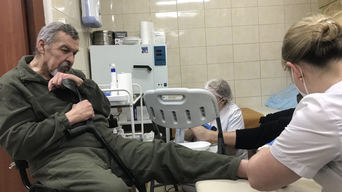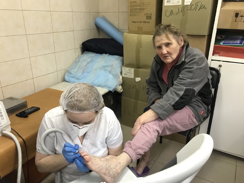На первом этаже приюта находятся инвалиды-колясочники. К ним диаподолог Яна спустилась сама и на месте сделала педикюр.