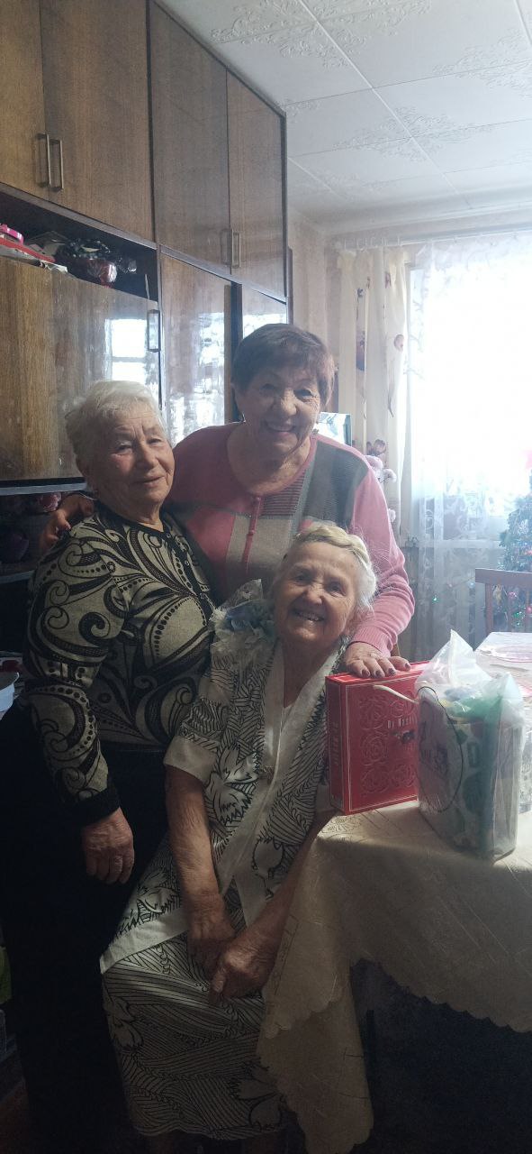 «Серебряные» волонтеры культуры Корниенко Л. Ф. (руководитель клуба «Хозяюшка» и руководитель ансамбля «Надежда») с Порецковой Е. (член клуба и ансамбля) пришли поздравить старшего участника клуба с юбилейной датой рождения.