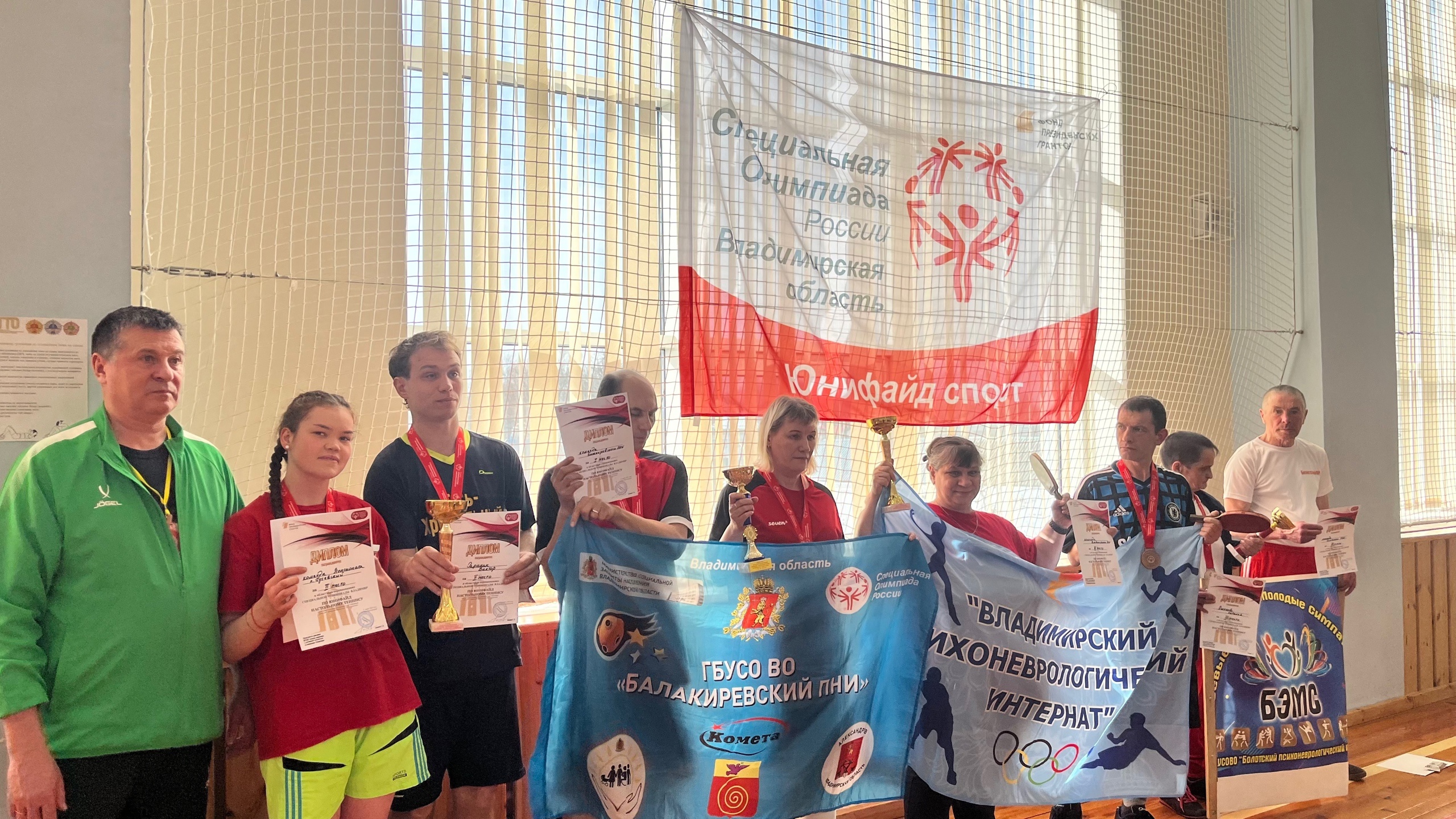 Партнерами у спецолимпийцев были добровольцы разного возраста и разных профессий. Ученики спортивной школы им. Паушкина в Гусь-Хрустальном также выступили волонтерами. Они здорово помогли с разминками и судейством, за что получили благодарность от организаторов турнира.