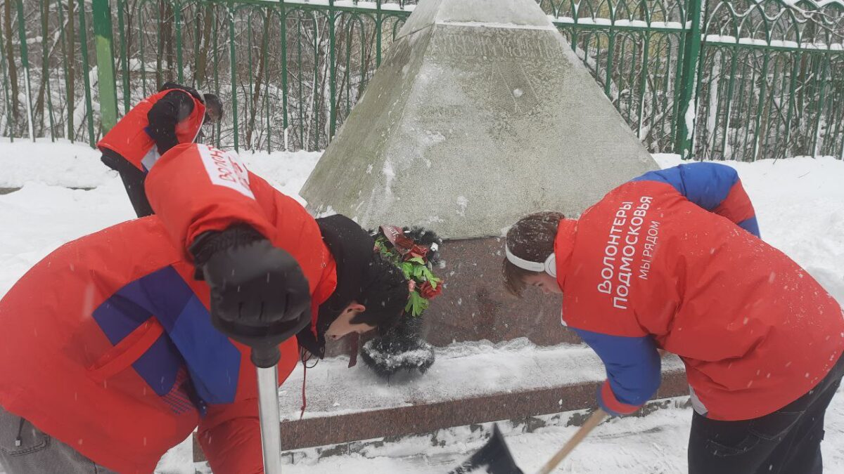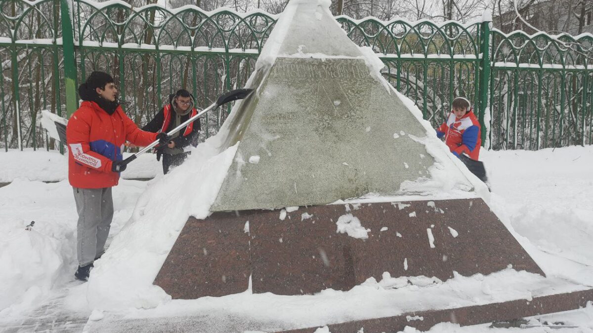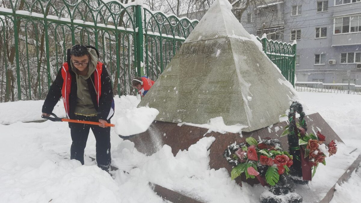 В условиях обильного снегопада участники очистили от снега памятник и прилегающую территорию на улице Большевистской. Мемориал посвящен жителям Дмитровского округа, погибшим при исполнении воинского долга в Афганистане, Чечне и других локальных конфликтах.