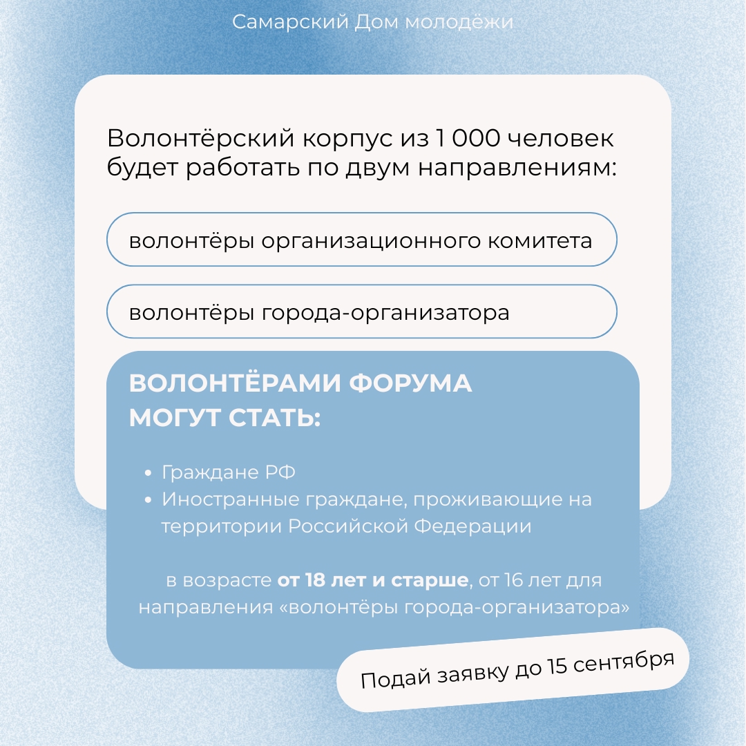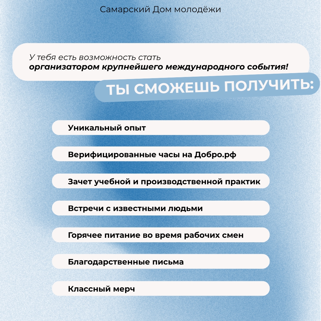 Самара готовится принять XIII Международный спортивный форум «Россия — спортивная держава». С 5 по 7 ноября наш город превратится в центр притяжения для более чем 3000 участников со всей страны. Волонтёры станут визитной карточкой форума, его сердцем и лицом. Это уникальный шанс попробовать себя в масштабной организации события, завести новые знакомства и представить родной регион на федеральном уровне.