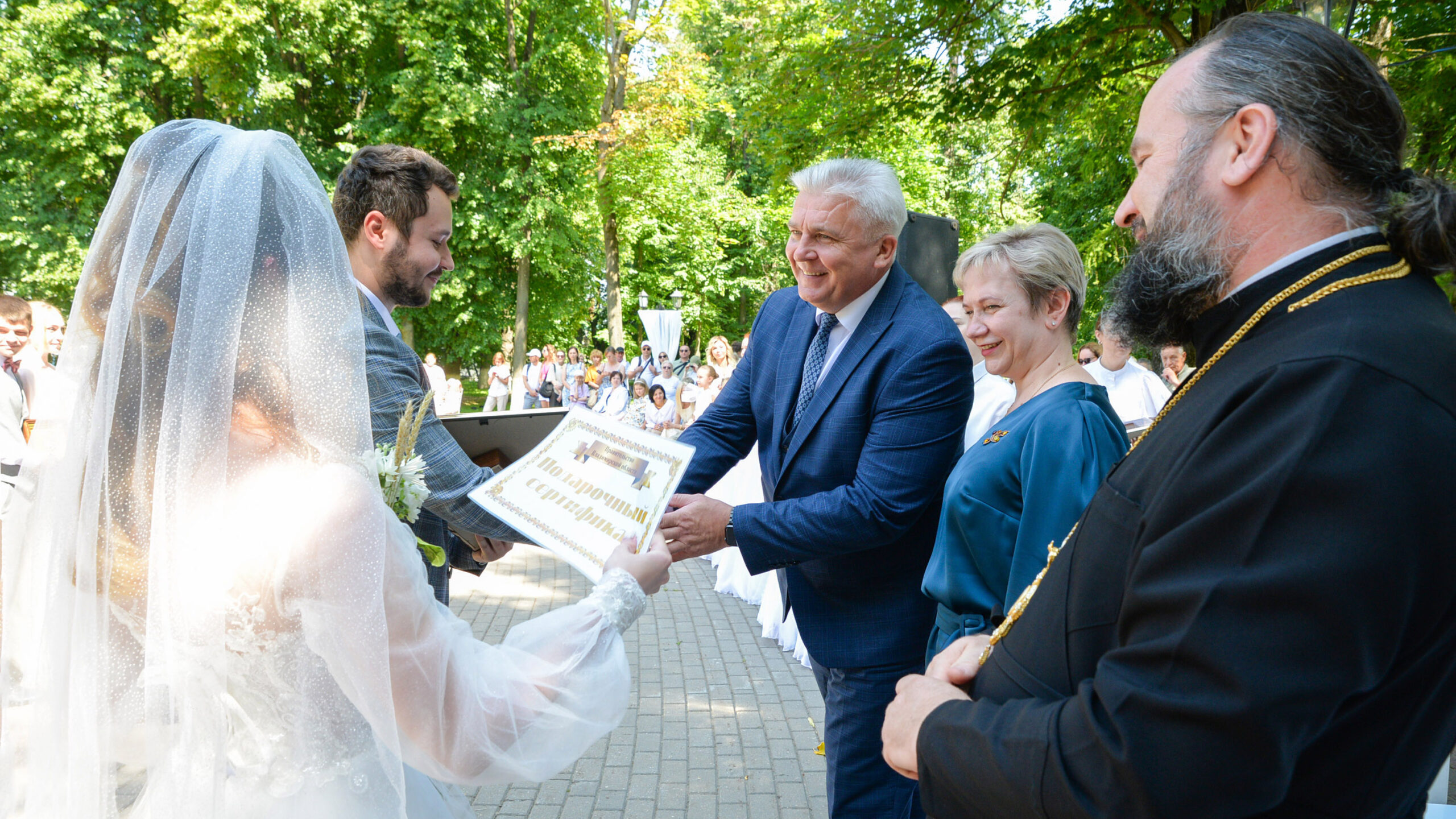 Все молодожёны получили в подарок иконы святых Петра и Февронии Муромских, а также приветственные адреса от администрации Владимирской области и города Владимира. Также им были вручены сертификаты на подарки.