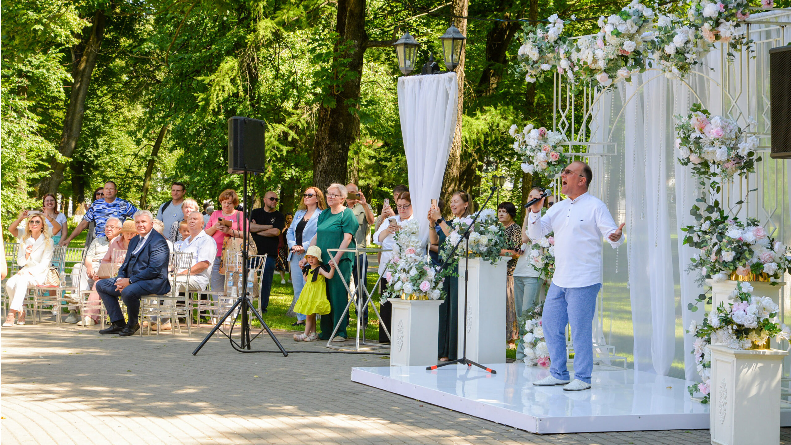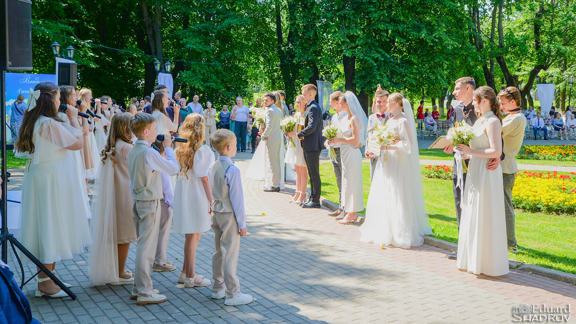 Сергей Артемьев исполняет музыкальное поздравление для молодоженов в День семьи, любви и верности во Владимире. Фото Э. Шадров