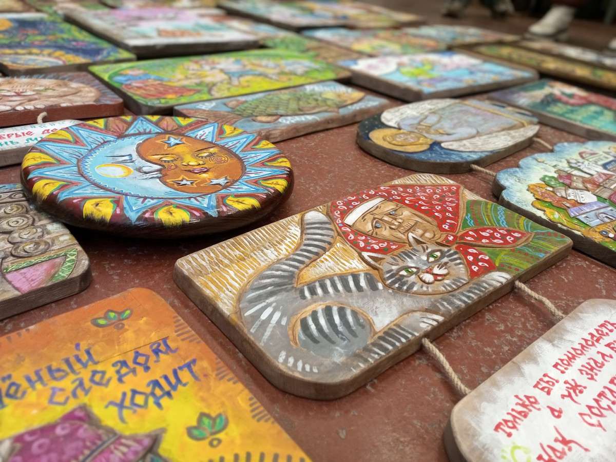 Выставка состоит из уникальных деревянных панно с элементами живописи, созданными вологодскими мастерами – художником, иллюстратором Олегом Малининым и резчиком по дереву Алексеем Борисовым.