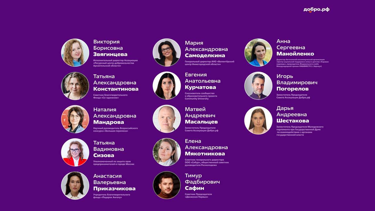 «В него вошли 26 человек – представители нашего сообщества, руководители ресурсных центров, федеральных движений, друзей и ключевых партнёров. Есть те, кто уже работал в составе Совета, а есть новые лица. Например, Анна Манойленко – Председатель Федерального клуба Премии #МЫВМЕСТЕ “МАЯК” и директор центра социальной поддержки семьи и детства “Караван надежды”, Татьяна Сизова – Уполномоченный по защите прав предпринимателей в Москве. И многие другие, но все они эксперты своего дела, готовые вместе с нами делать добро нормой жизни в России», – сообщил в телеграм-канале Председатель Комитета Госдумы по молодёжной политике, руководитель Ассоциации Добро.рф Артем Метелев.