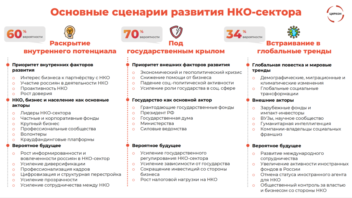 Второй – «Встраивание в глобальные тренды» (34% вероятности) – ориентирован на долгосрочную перспективу. Несмотря на существующие ограничения, эксперты не исключают такой путь. Демографические изменения, климатические вызовы и миграционные процессы будут только нарастать. НКО, которые уже сегодня накапливают экспертизу в этих темах, смогут внести вклад в решение глобальных задач.