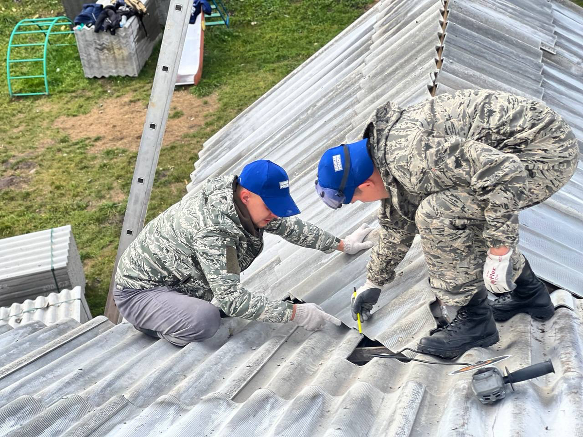 Волонтёры восстанавливают кровлю школы в селе Густомой. Фото: Волонтёрский лагерь "Курский рубеж"
