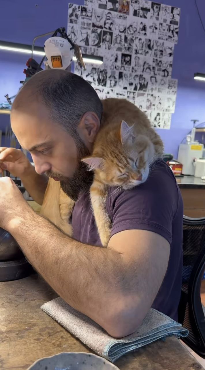 Многие удивляются, что Закарья совершенно не реагирует на громкие стуки и звуки инструментов. На большинстве роликов кот-ювелир спит, оперевшись головой о руку мастера или свисая с его шеи. Но для Дауда это, кажется, привычное дело. Ведь в такой обстановке питомец рос с первых дней.