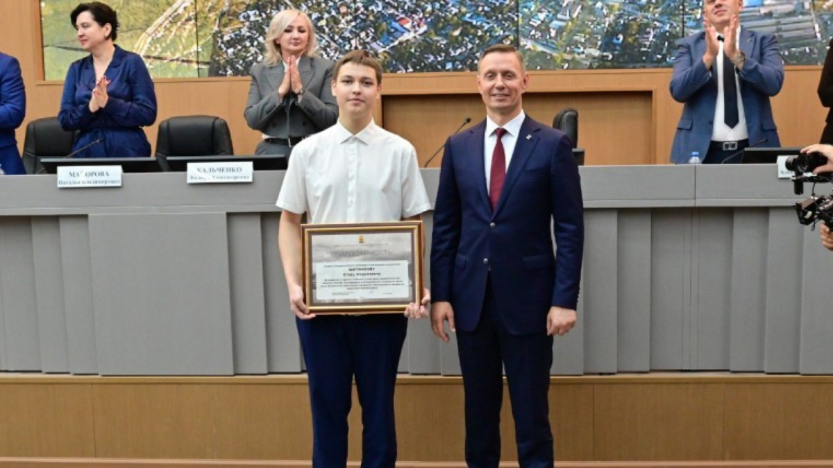 Глава города Андрей Кравченко вручил парню, который спас бабушку, почётную грамоту в рамке. Мальчик же быстро ответил на рукопожатие, взял награду и вернулся на место.