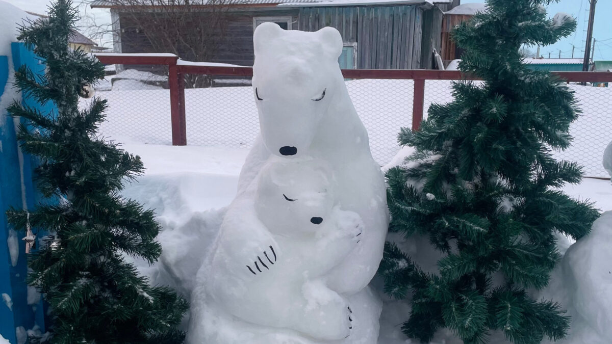 «Уже шестой год мы с супругом делаем снежные фигуры. Были и олени, и шаманы, и танцующие бабушка с дедушкой. Леплю из сырого снега, поливаю водой. До идеала довожу уже инструментами. Недавно купили электрическую пилу, с ней дело идёт гораздо быстрее», – делится Наталья.