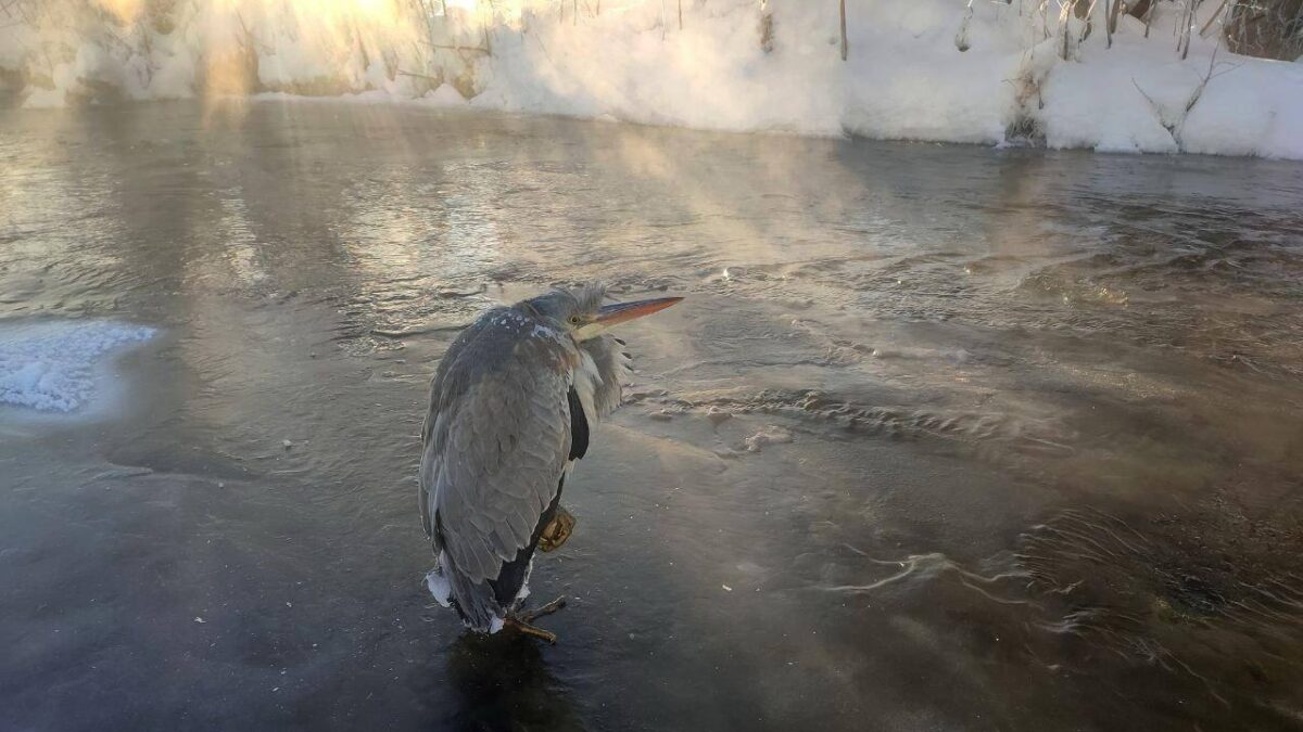 Серая цапля примёрзла лапами ко льду и не могла двигаться. Фото: Телеграм-канал «Подслушано Пермь»