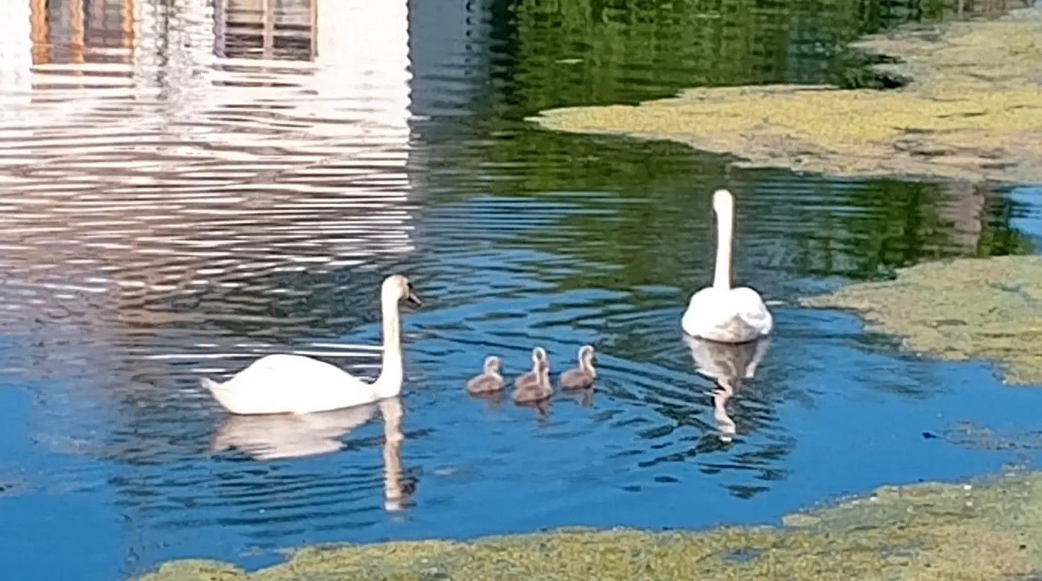 По словам местных жителей, за рождением лебединой семьи они наблюдали несколько лет. Сначала лебедь прилетал на реку Большая Калиновка один, а потом уже вместе со своей лебёдушкой. В этом году они впервые вывели четверых птенцов.