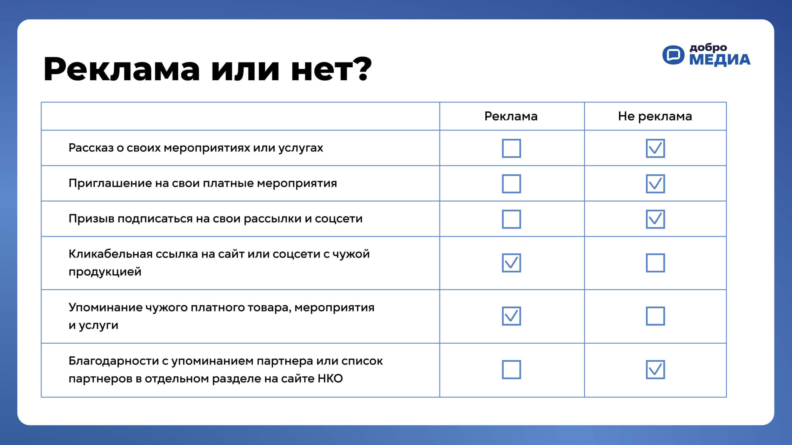 К таким сообщениям относятся посты и тексты с информацией о бесплатных услугах вашей организации, вебинарах, фестивалях, спортивных событиях. А вот приглашение на организованный вами благотворительный концерт известного артиста с покупкой билетов или на ярмарку с продажей сувениров, в которой вы участвуете, могут признать рекламой.