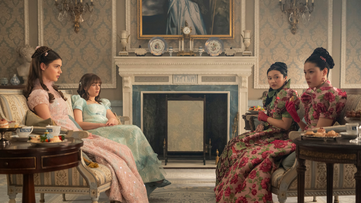 Флоренс Хант в роли Гиацинты Бриджертон, Клаудия Джесси в роли Элоизы Бриджертон, Мишель Мао в роли Розамунды Ли и Изабелла Вэй в роли Поузи Ли в 4-м сезоне «Бриджертонов». Фото: LIAM DANIEL/NETFLIX