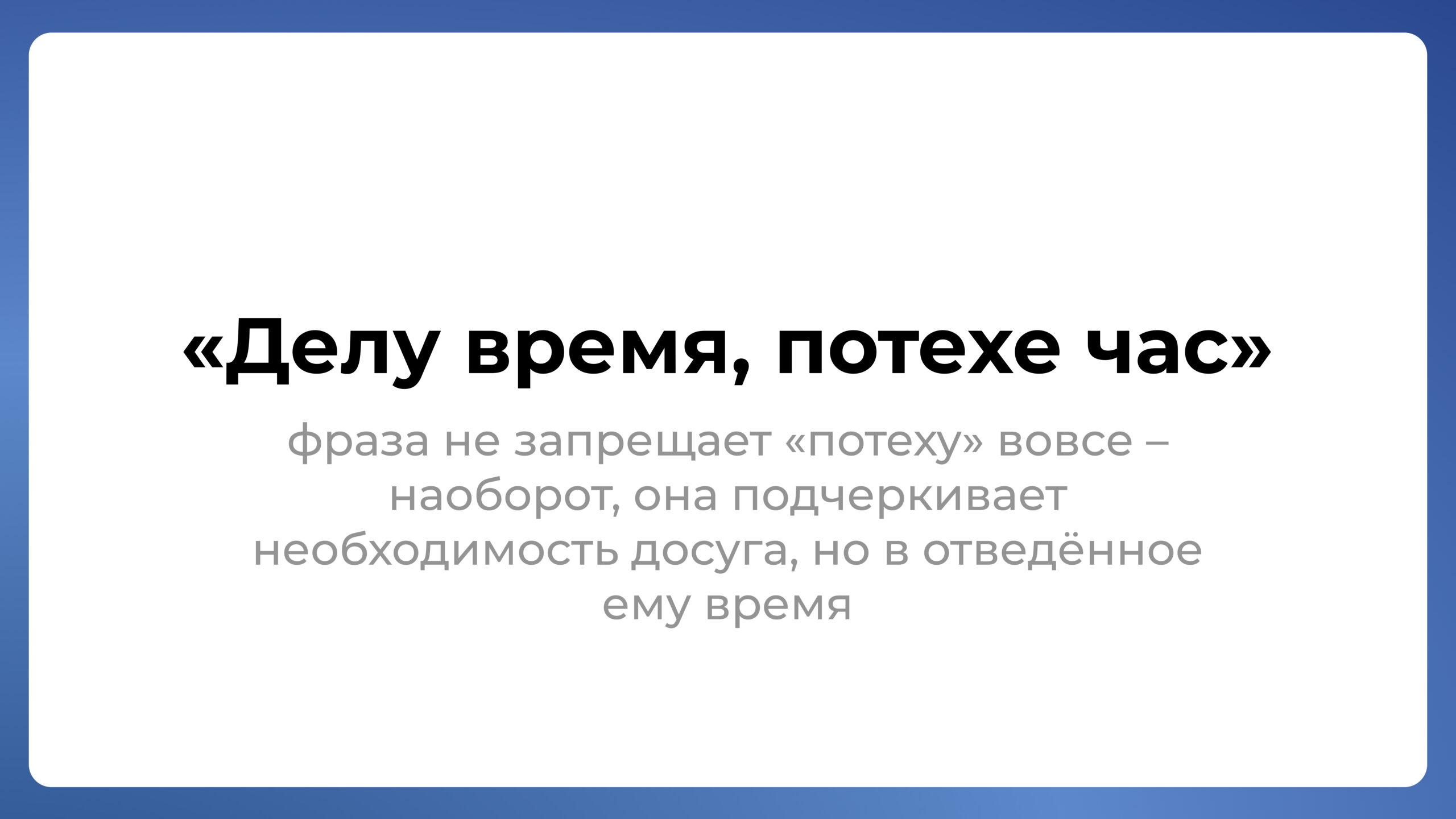 На первый взгляд пословица «делу время, потехе час» говорит о том, что сначала нужно заняться работой, а уже потом позволить себе отдых. Такой порядок кажется очевидным. Но важно уловить и другой пласт: эта фраза не запрещает «потеху» вовсе – наоборот, она подчеркивает необходимость досуга, но в отведённое ему время.
