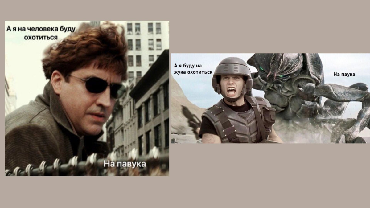 Одна из самых популярных версий – Доктор Осьминог из «Человека-паука» с текстом «Буду на паука охотиться». Другие пользователи вставляют в шаблон своих питомцев, героев игр или просто знакомых с милым выражением лица.