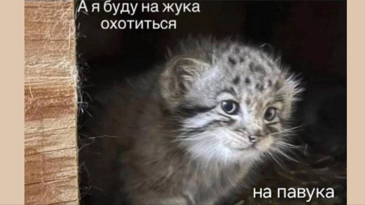 В соцсетях завирусился новый мем с детёнышем манула. На картинке зверёк выглядывает из загона с серьёзной мордочкой с подписью: «А я буду на жука охотиться. На паука». Пользователи в восторге от смешного и милого сочетания, и мем моментально разлетелся по сети.