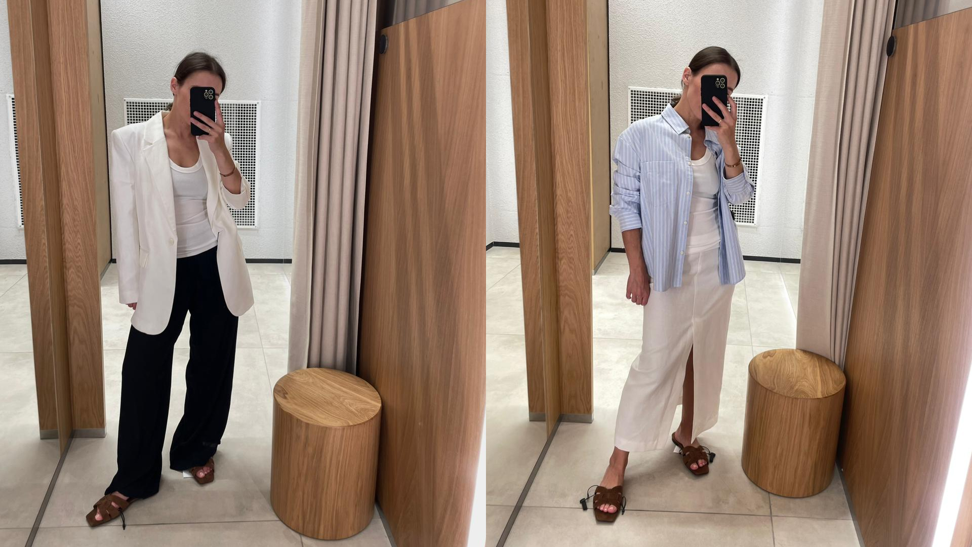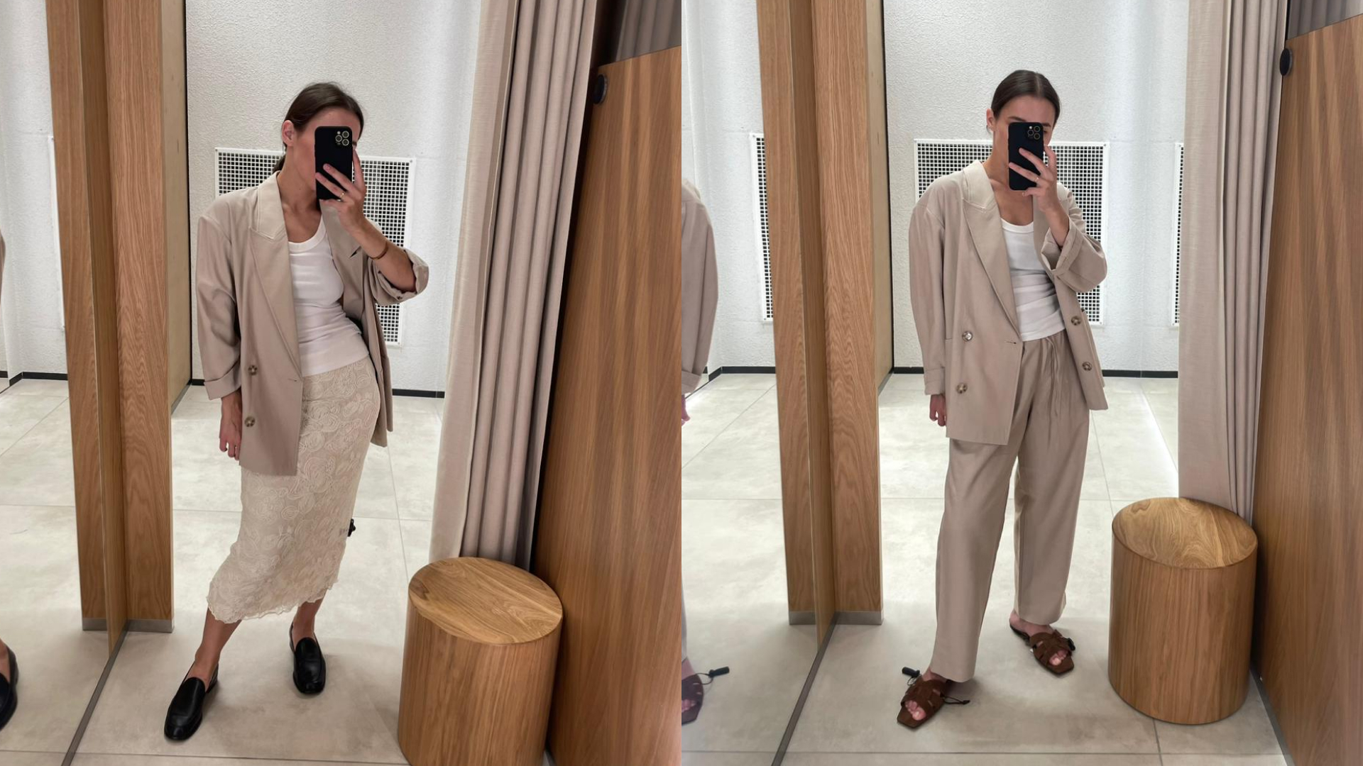 «Особенно часто сейчас носят костюмы. Вниз лучше надеть базовую майку. А на ноги – сабо», – объяснила Оксана Дунаева.