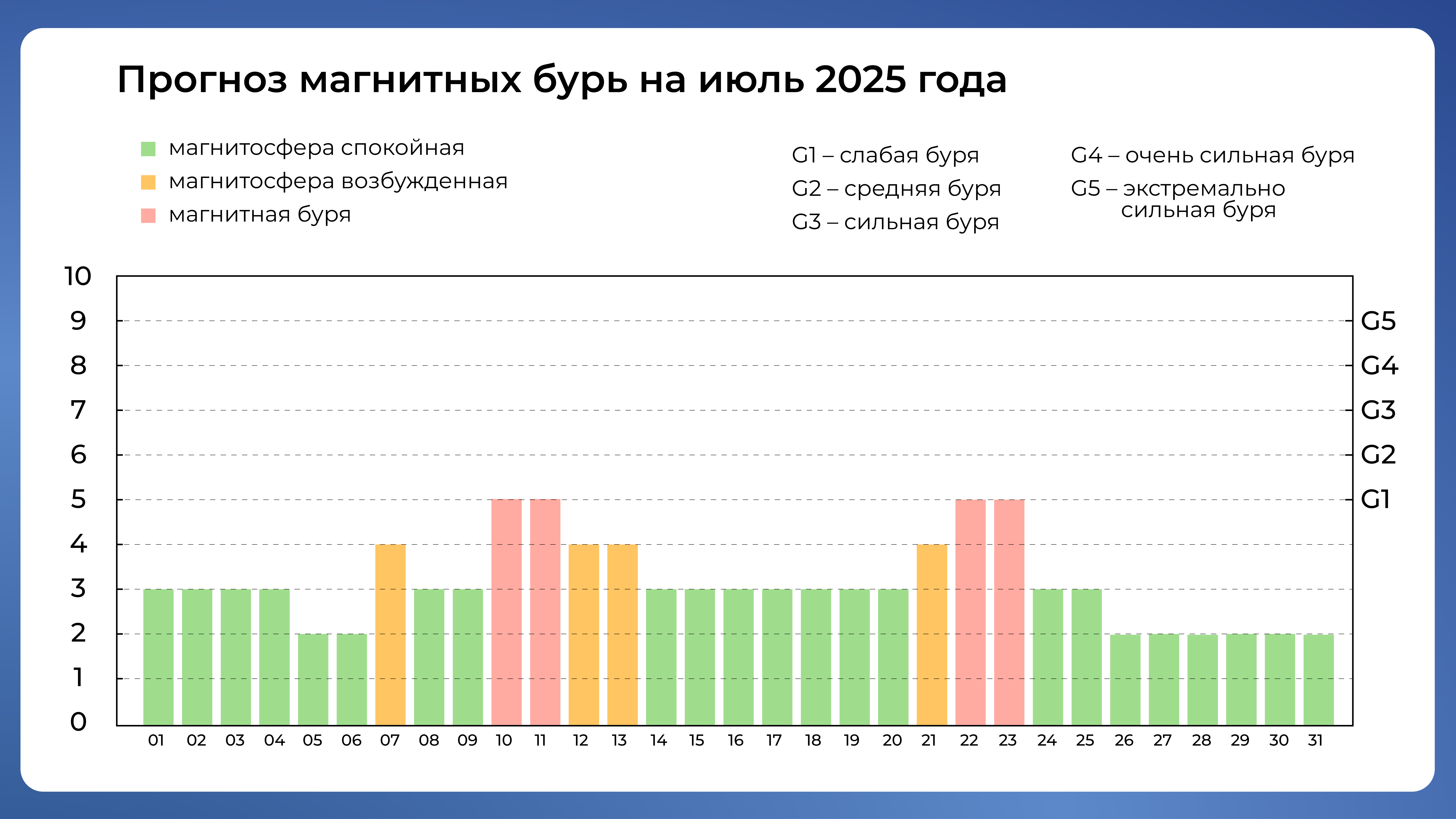 Календарь магнитных бурь на июль 2025 года. Данные от 27 июня. Графика: Добро.Медиа