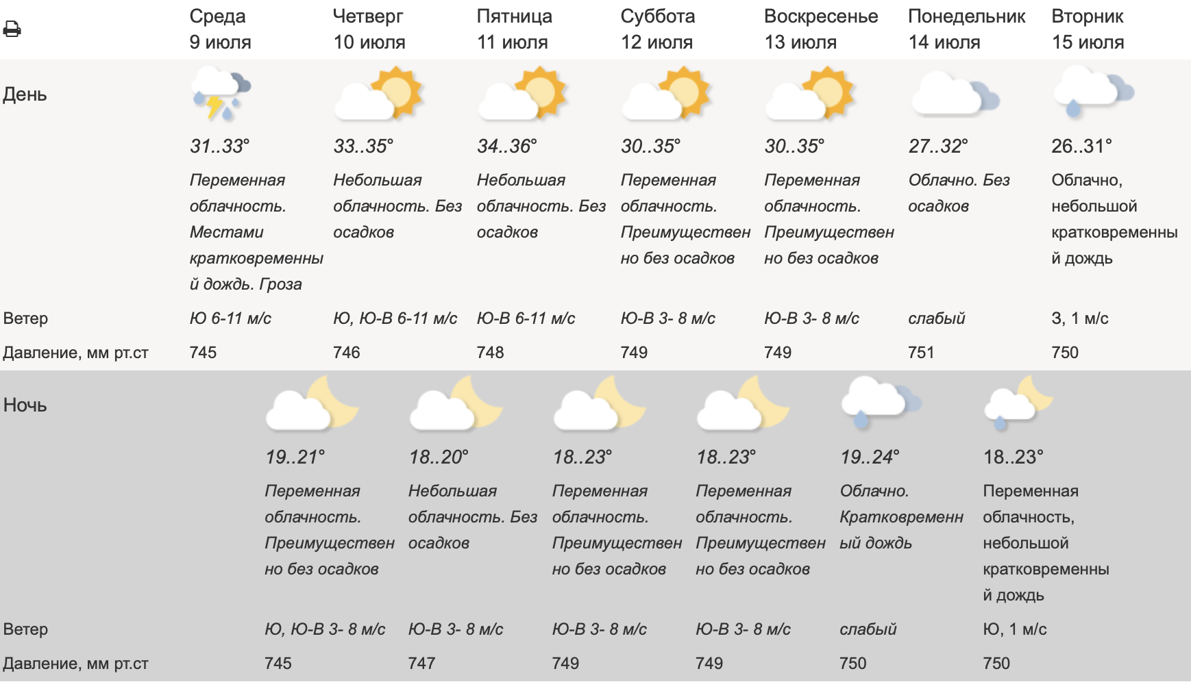 Ночью столбик термометра опустятся до +19°C. Южный ветер усилится до 6-11 м/с. В течение дня ожидается переменная облачность. Высока вероятность кратковременных дождей и гроз, особенно во второй половине дня и вечером (с 12:00 до 21:00). Наиболее вероятны осадки в западных районах столицы.