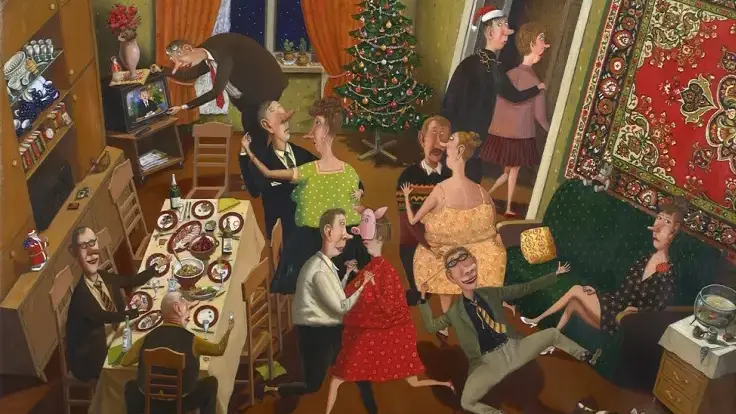 Новогодние картины – одно из направлений творчества самобытного художника. Например, в этой работе он изобразил весёлую компанию: мужчины за столом с закусками произносят тосты, три пары танцуют на фанерном полу. У ковра на стене грустно сидит скучающая дама, пока её возлюбленный выплясывает гапак. Один из гостей уводит свою спутницу в соседнюю комнату. Другой – спорит с телевизором. У каждого героя – своя история, полная иронии, а иногда и грусти.