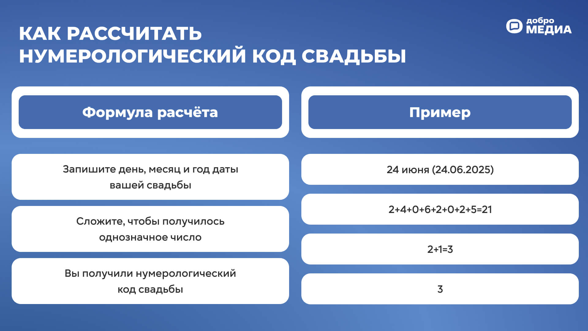 Для расчёта нумерологии свадьбы нужно сложить все цифры, которые есть в дате. Для примера возьмём число 24.06.2025. Складываем: 2+4+0+6+2+0+2+5. Получается 21. Снова складываем цифры: 2+1=3.