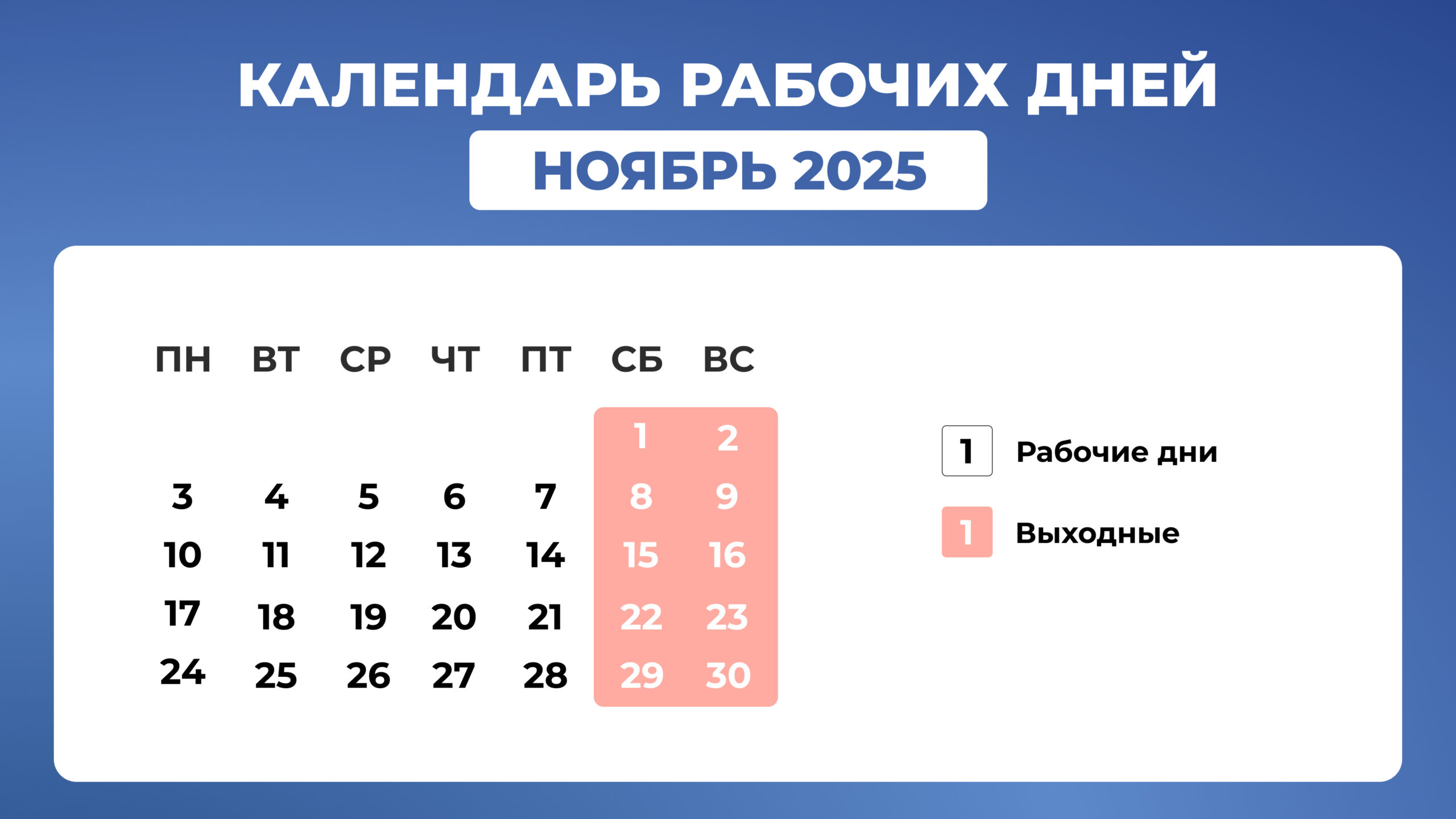 Месяц начнётся с шестидневной рабочей недели: она пройдёт с 27 октября по 1 ноября – субботу, рабочий день которой будет сокращён на один час. Также нас ждут два праздничных дня 3-го и 4-го числа.