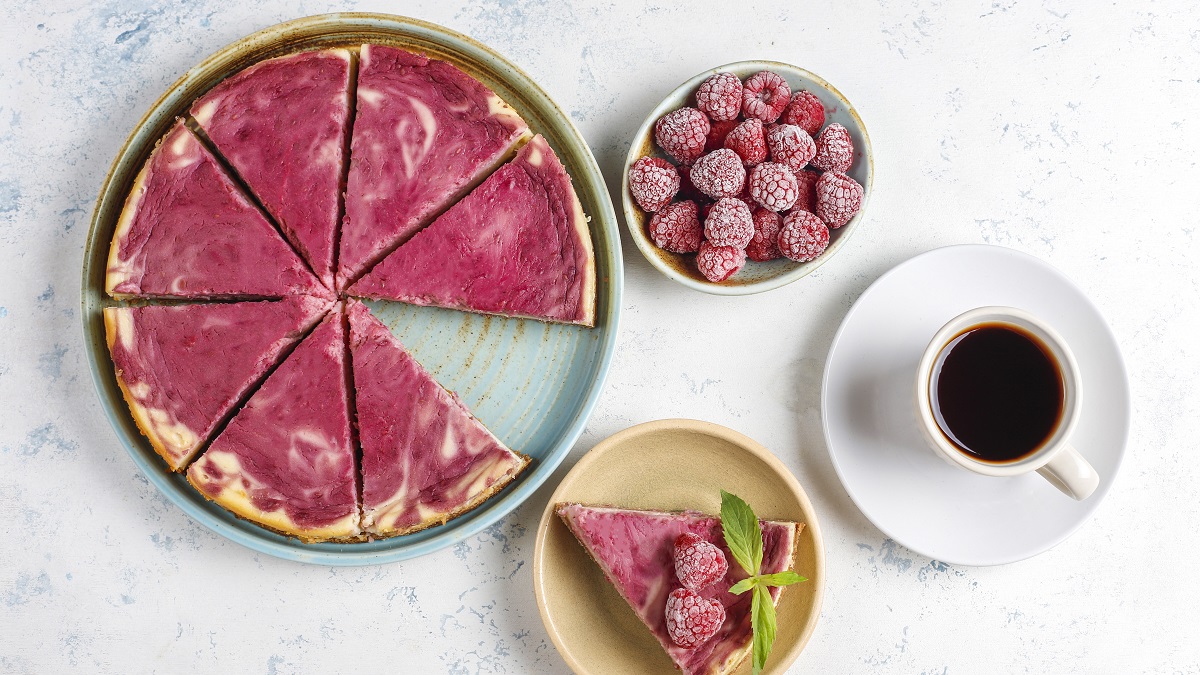 - Чизкейк с малиновым топпингом – свежие ягоды или соус