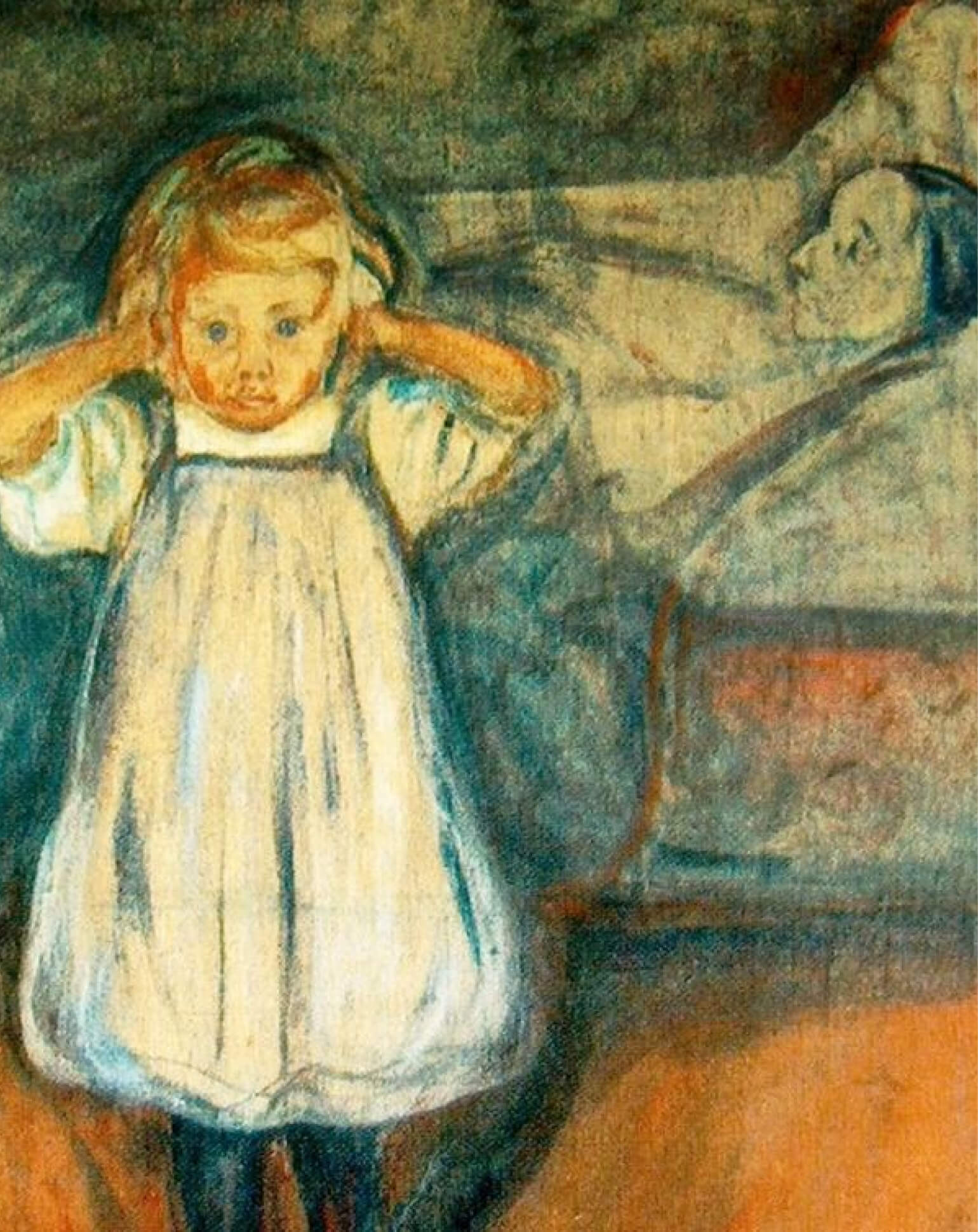 На лице девочки, закрывающей уши руками, – отчаяние и даже безумие. Она не хочет слышать страшную новость, которую хочет донести кто-то из взрослых. Бледное тело мёртвой женщины лежит на заднем плане. К её постели подходят родственники, будто не замечая ребёнка.