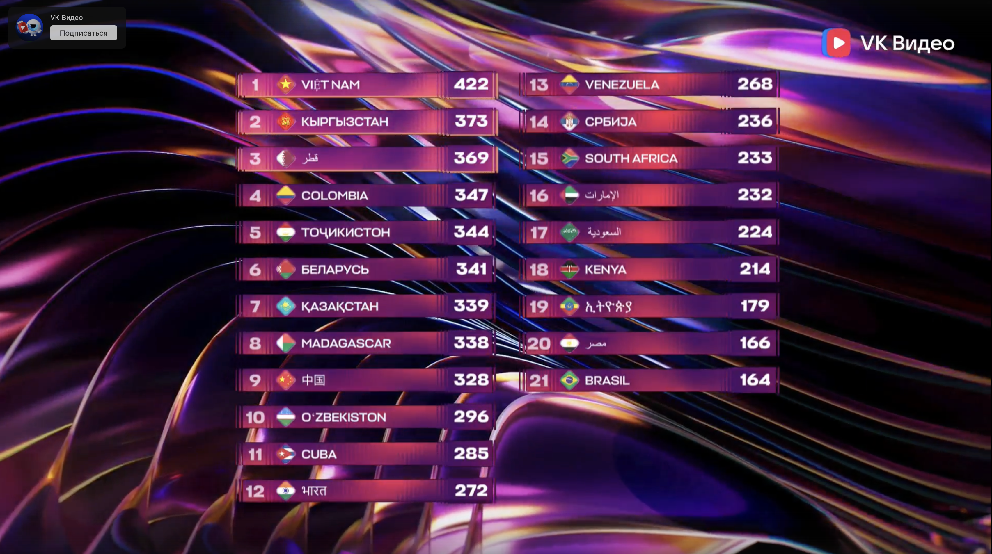 Турнирная таблица Международного музыкального конкурса «Интервидение-2025». Фото: Кадр из трансляции конкурса