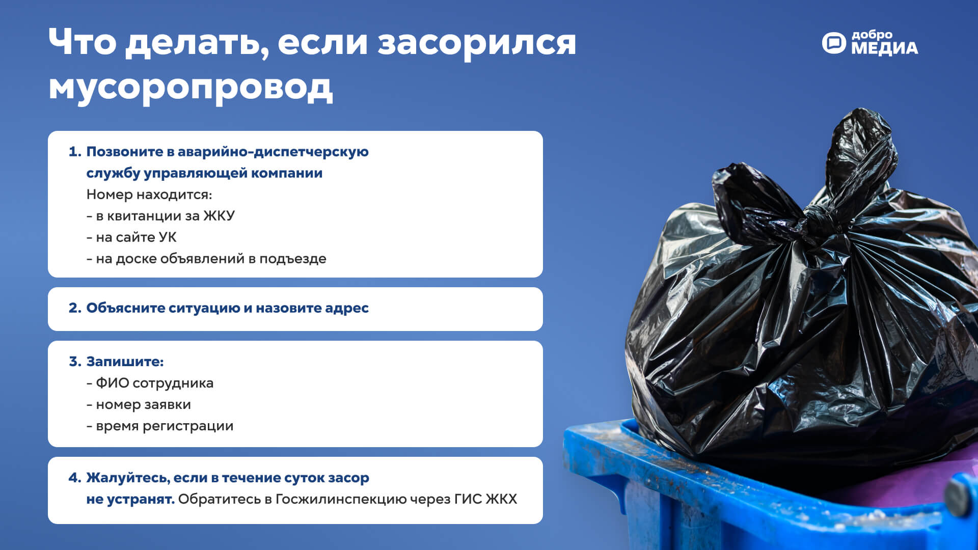 Как поступить, если засорился мусоропровод? В материале Добро.Медиа рассказали, к кому обращаться, и дали инструкцию в четыре шага.