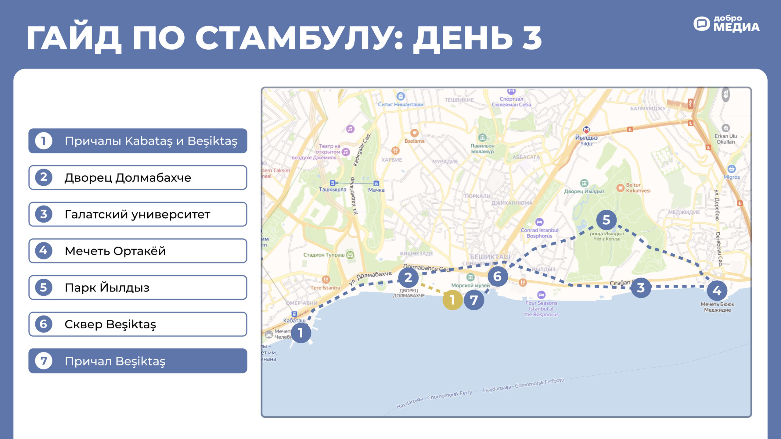 День третий. Ближайший к отелю причал – паром с видом на солнечный Стамбул до станции Kabataş или Beşiktaş – дворец Долмабахче – Галатский университет – мечеть Ортакёй – парк Йылдыз – сквер Beşiktaş – паром до отеля.
