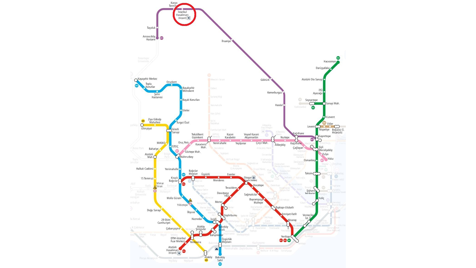 Метро в европейской части Стамбула. Сверху красным кружком выделена станция Международного аэропорта (IST).