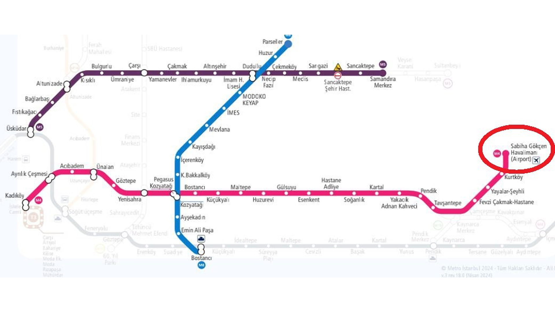 Метро в азиатской части Стамбула. Справа красным кружком выделена станция аэропорта имени Сабихи Гёкчен (SAW).