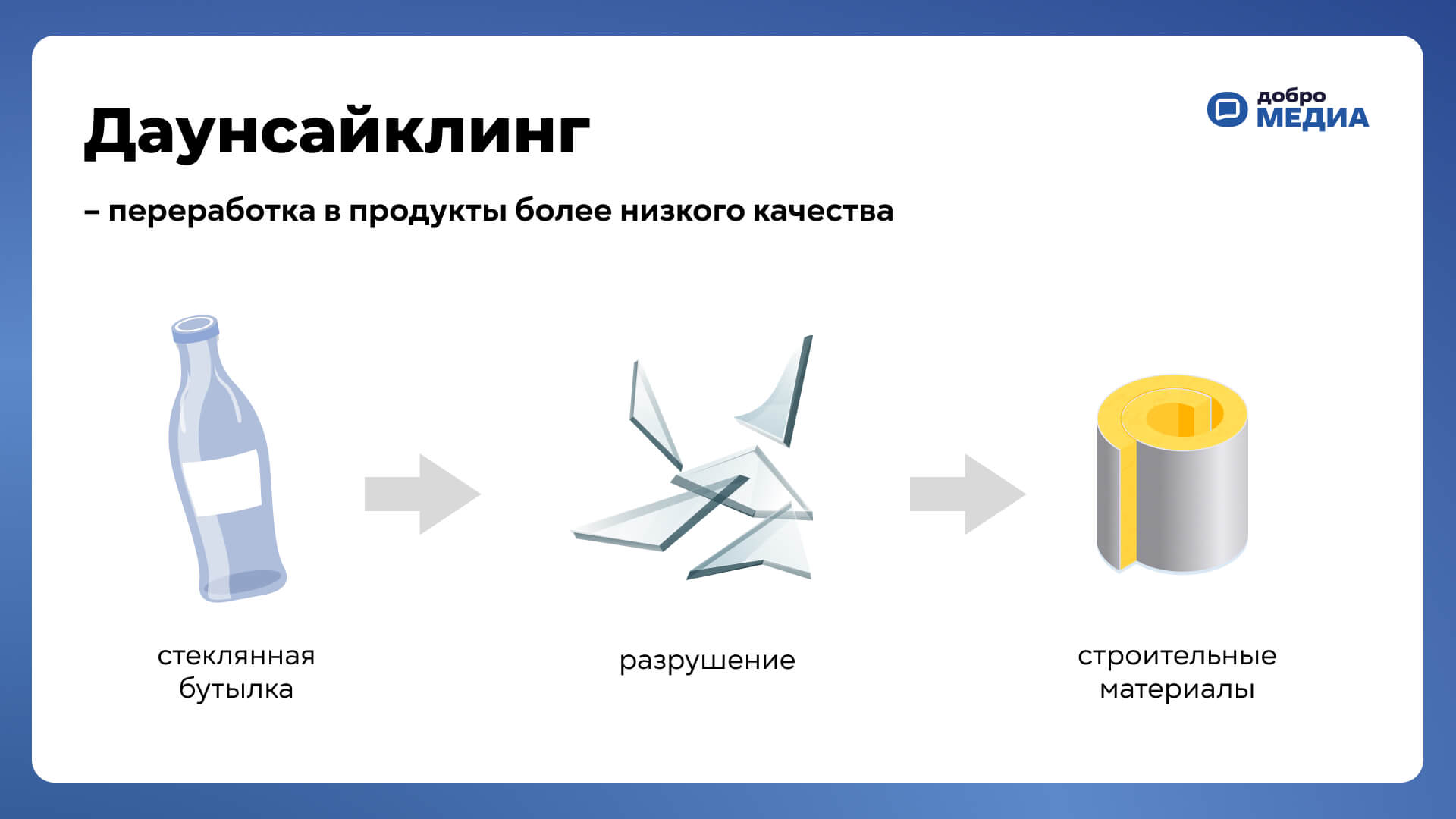 Даунсайклинг – это переработка материалов в продукты более низкого качества с постепенной деградацией свойств.
