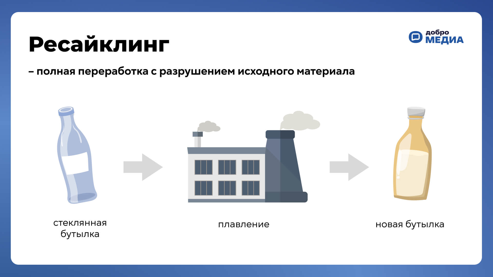 Ресайклинг – это полная переработка отходов с разрушением исходного материала для создания нового сырья или продукта.