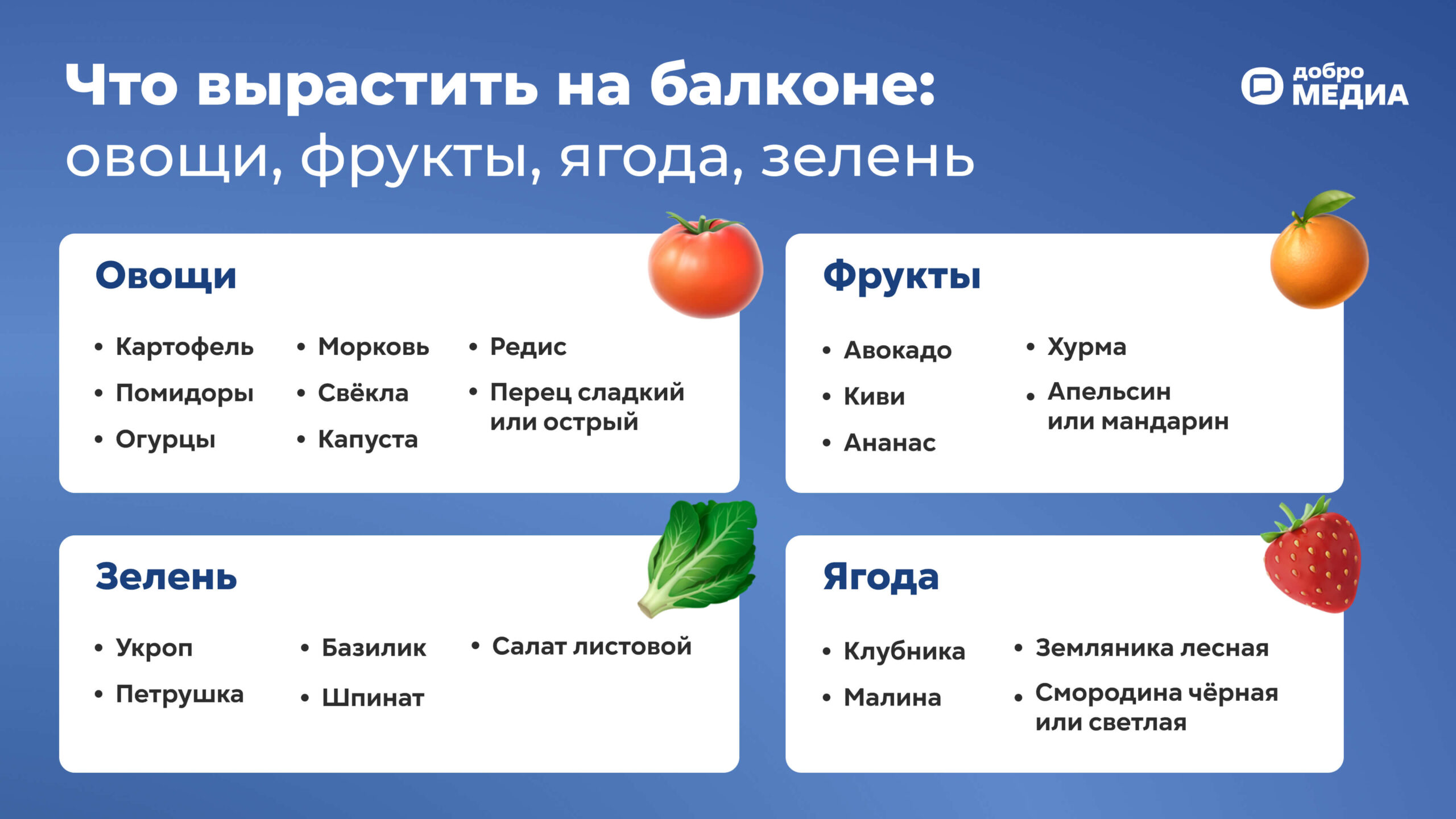 Помидоры, киви, смородина и укроп – что вырастить на балконе ещё, помимо овощей, фруктов и зелени? В материале Добро.Медиа рассказали, как создать огород в домашних условиях за 7 шагов.
