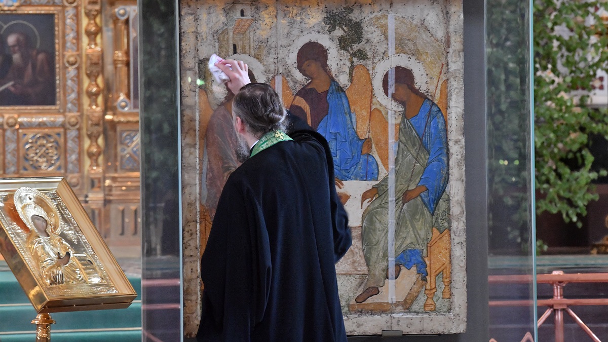 Священник у иконы Святой Троицы Андрея Рублёва. Фото: Komsomolskaya Pravda / Global Look Press / www.globallookpress.com
