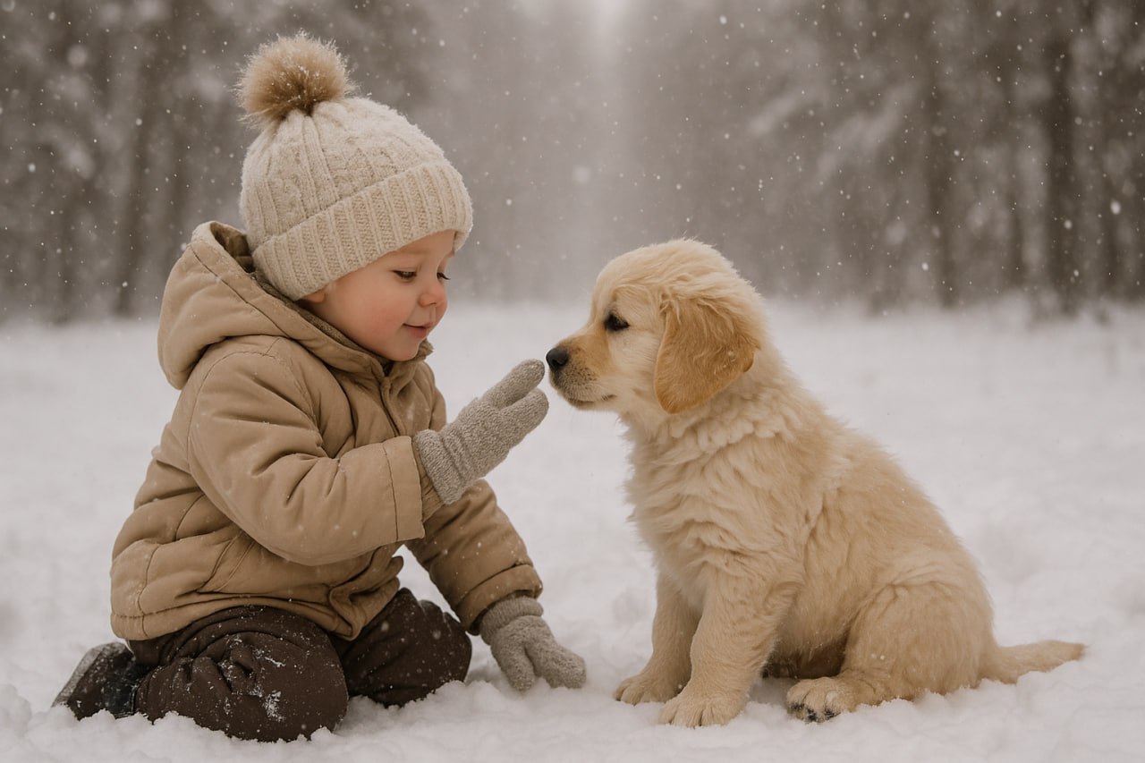 Сначала создам картинку по неудачному запросу: «Щенок и ребёнок зимой». Такой запрос действительно часто используют новички. Но проблема в том, что он слишком общий. Нейросеть не понимает, кто и что делает, как именно проявляется доброта. Результат получается красивым, но смысл теряется.